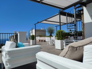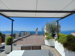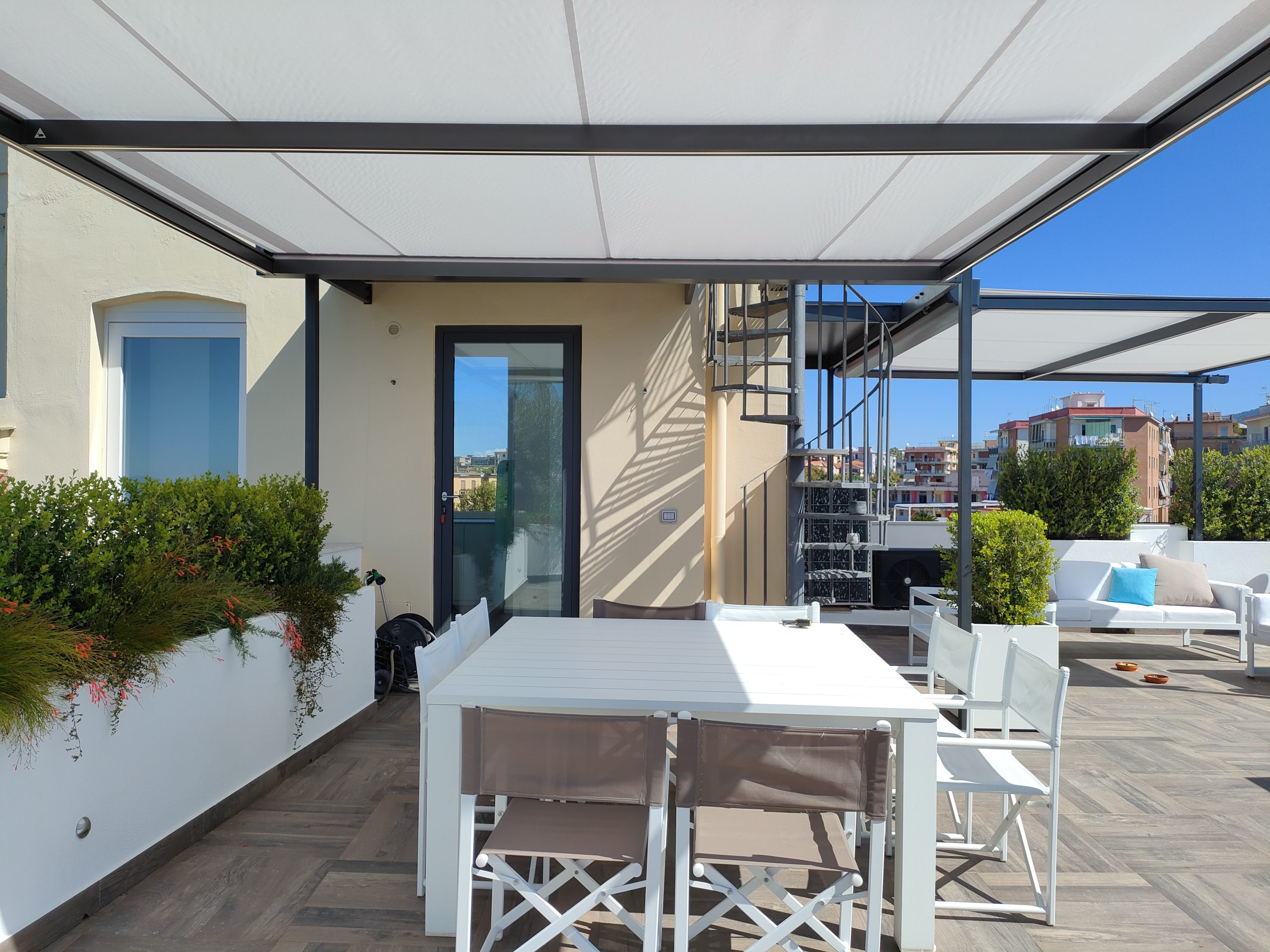 Il progetto prevede l’installazione di una pergola ombreggiante (STOBAG) che utilizza un telo retraibile tensionato che slitta su binari in alluminio. La gestione di apertura e chiusura del telo è effettuata a mezzo di radiocomando. I pilastri della pergola sono ancorati a fioriere in ferro zincato (MEDES METAL DESIGN) , che fungono da zavorra. La vegetazione esalta il clima mediterraneo dell’area, gli arredi sono in alluminio per una maggiore resistenza ad agenti atmosferici.